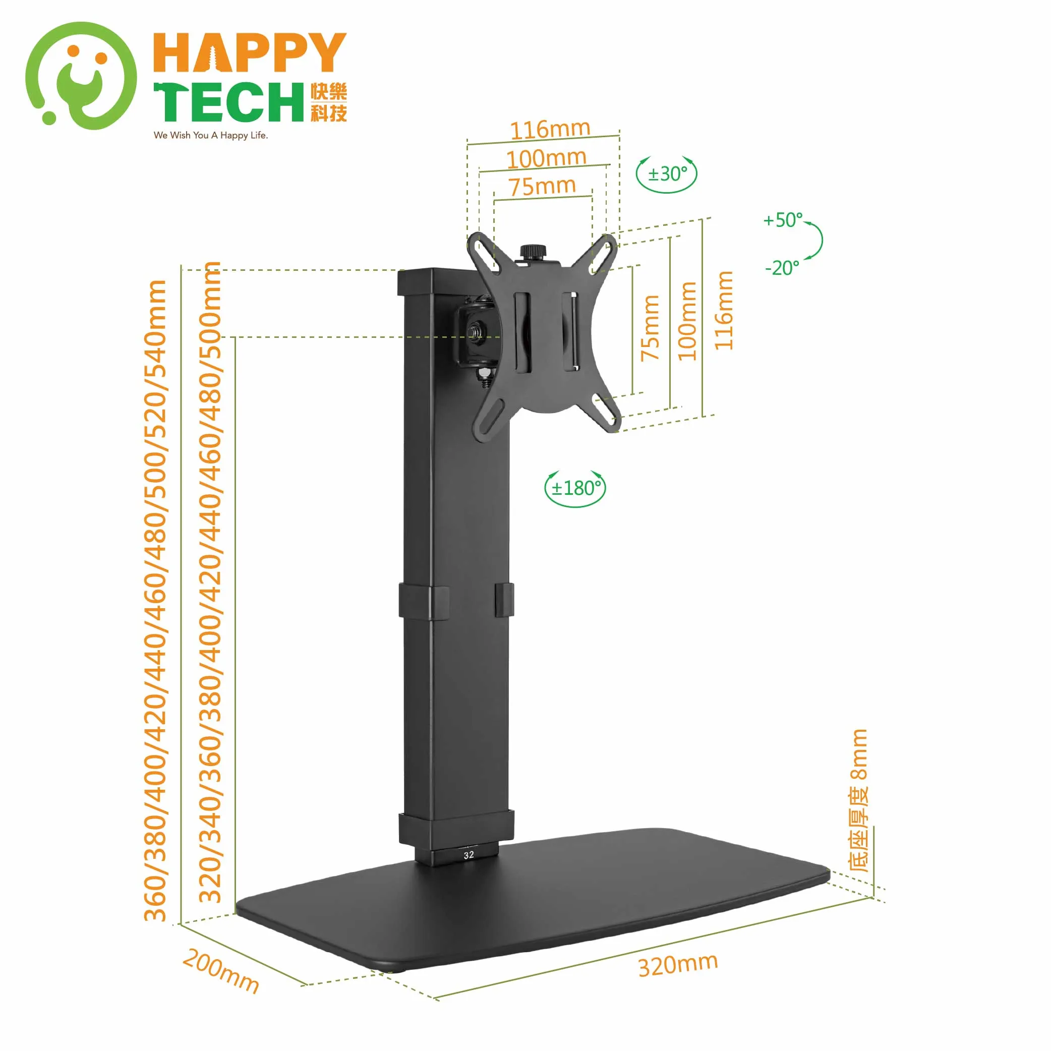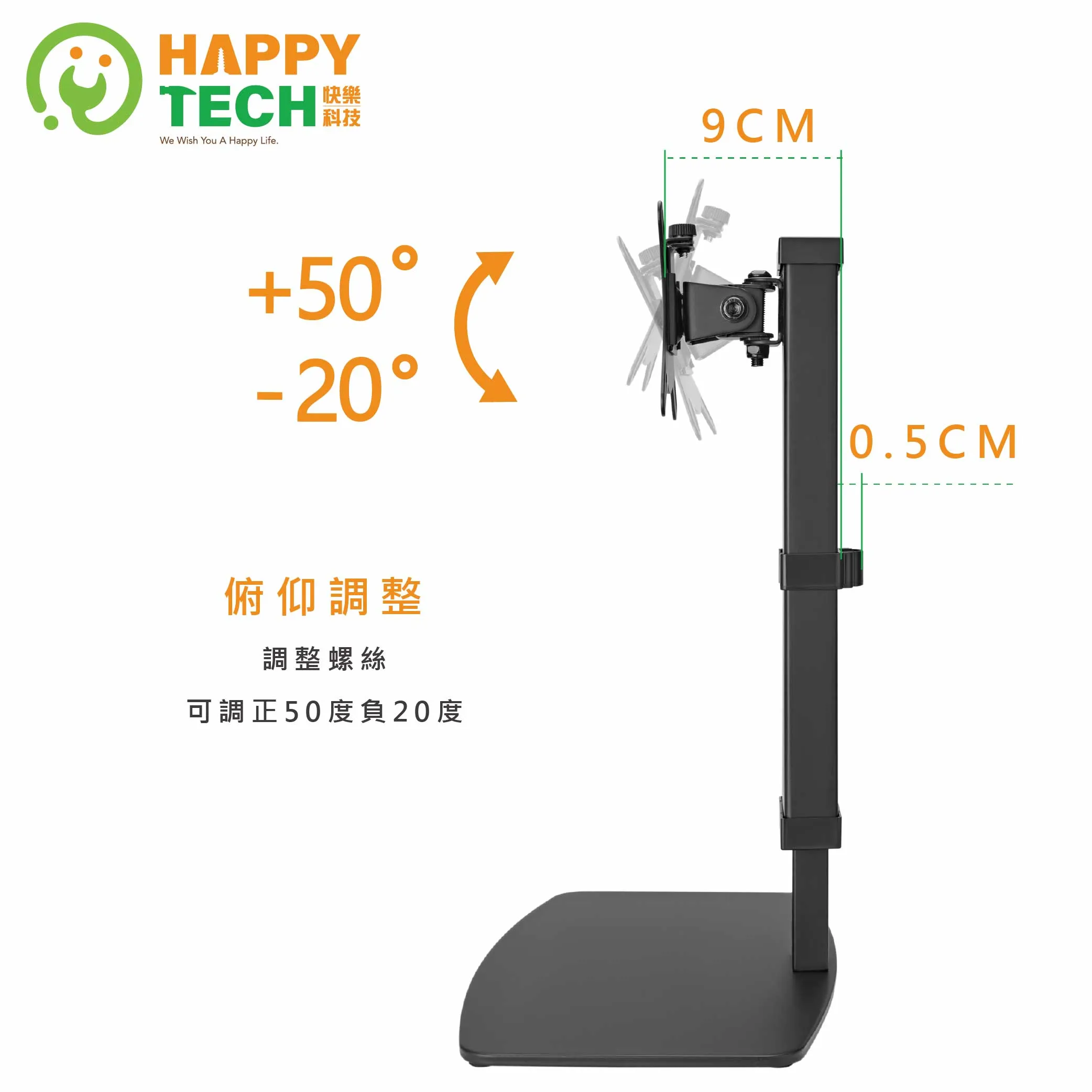 ●上下直立型支架,堅固耐用。十段高度調節設計,無須工具便能自行伸縮,輕鬆調整螢幕高度。