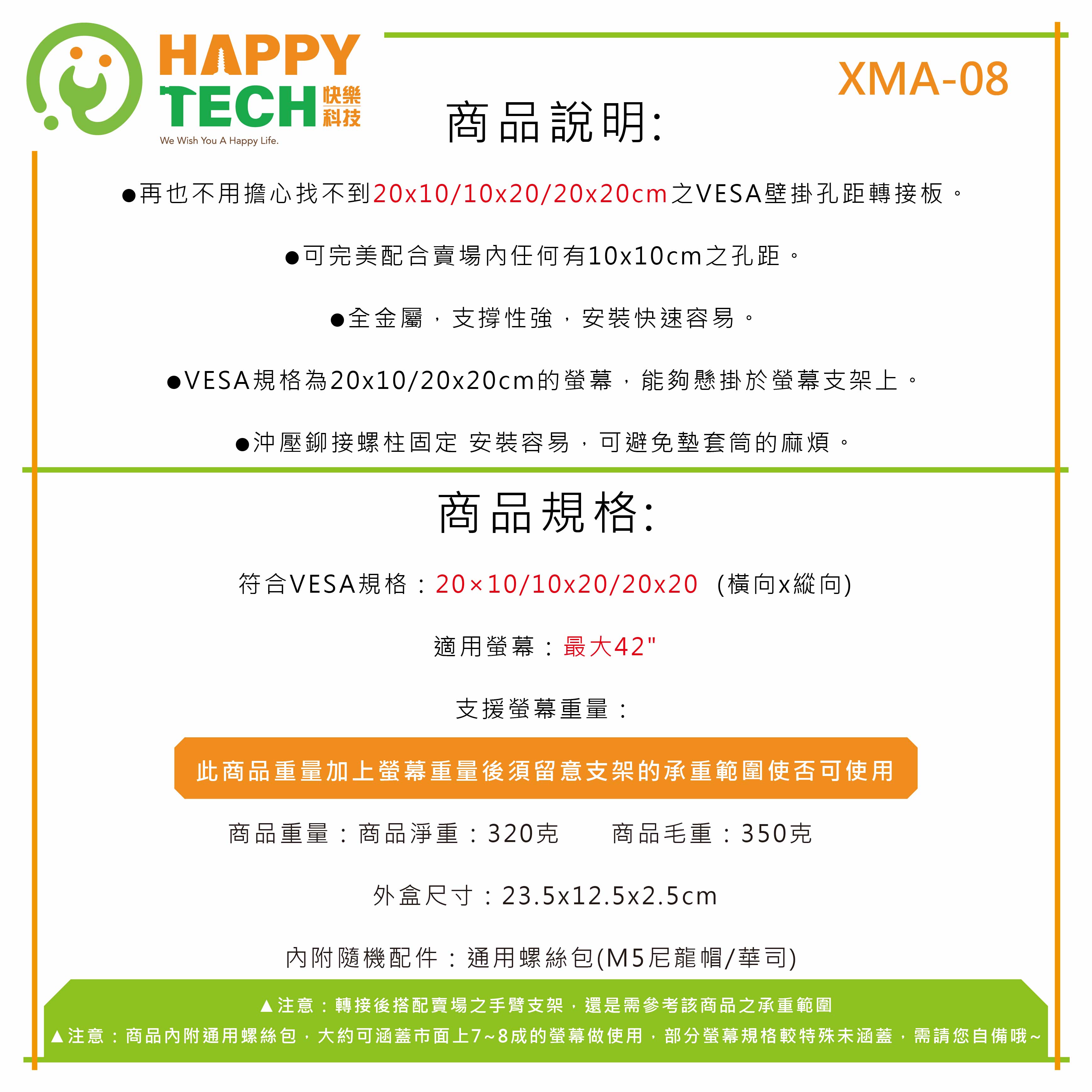 XMA-08 壁掛安裝孔距延伸片 轉接板20x10/20x20 VESA 延展片